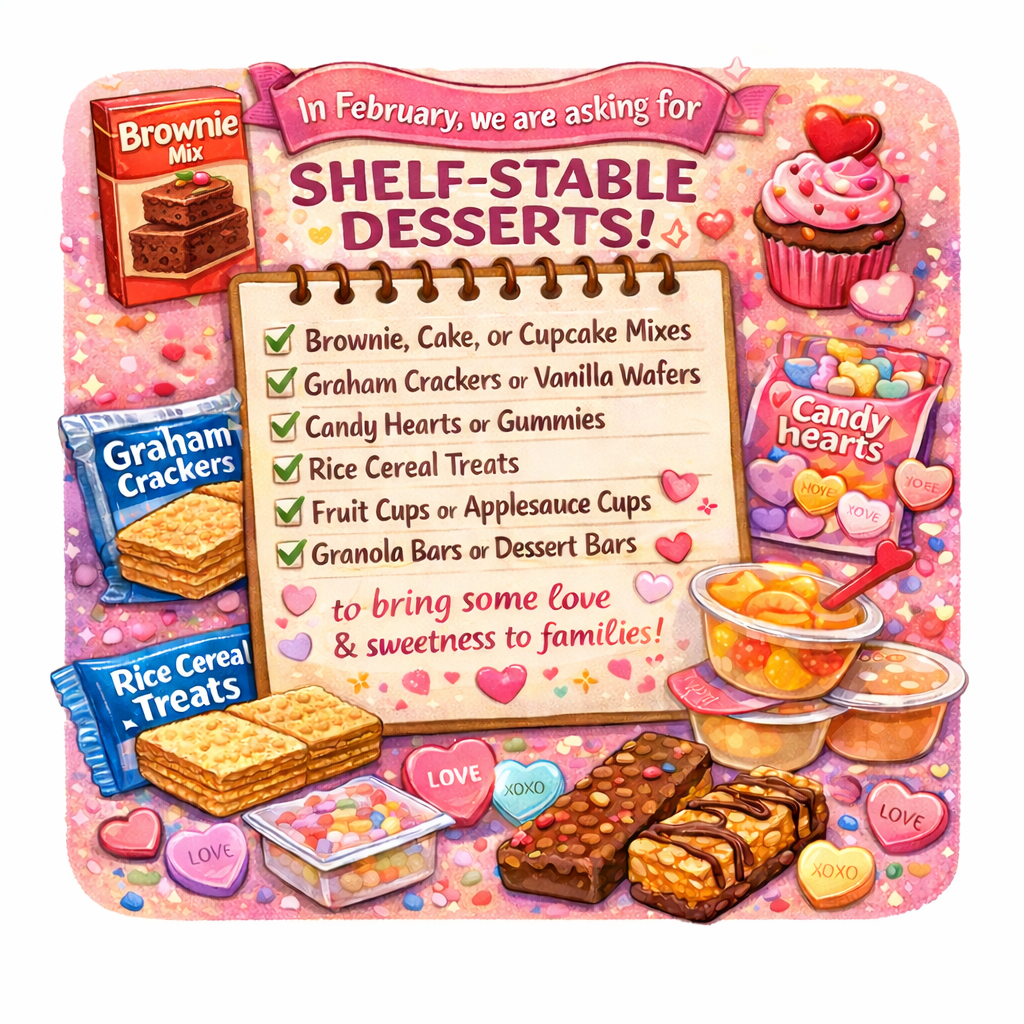 During February, the month of Valentine's days, we are asking for shelf-stable desserts to bring some love and a little extra sweetness to families, no matter their circumstances.