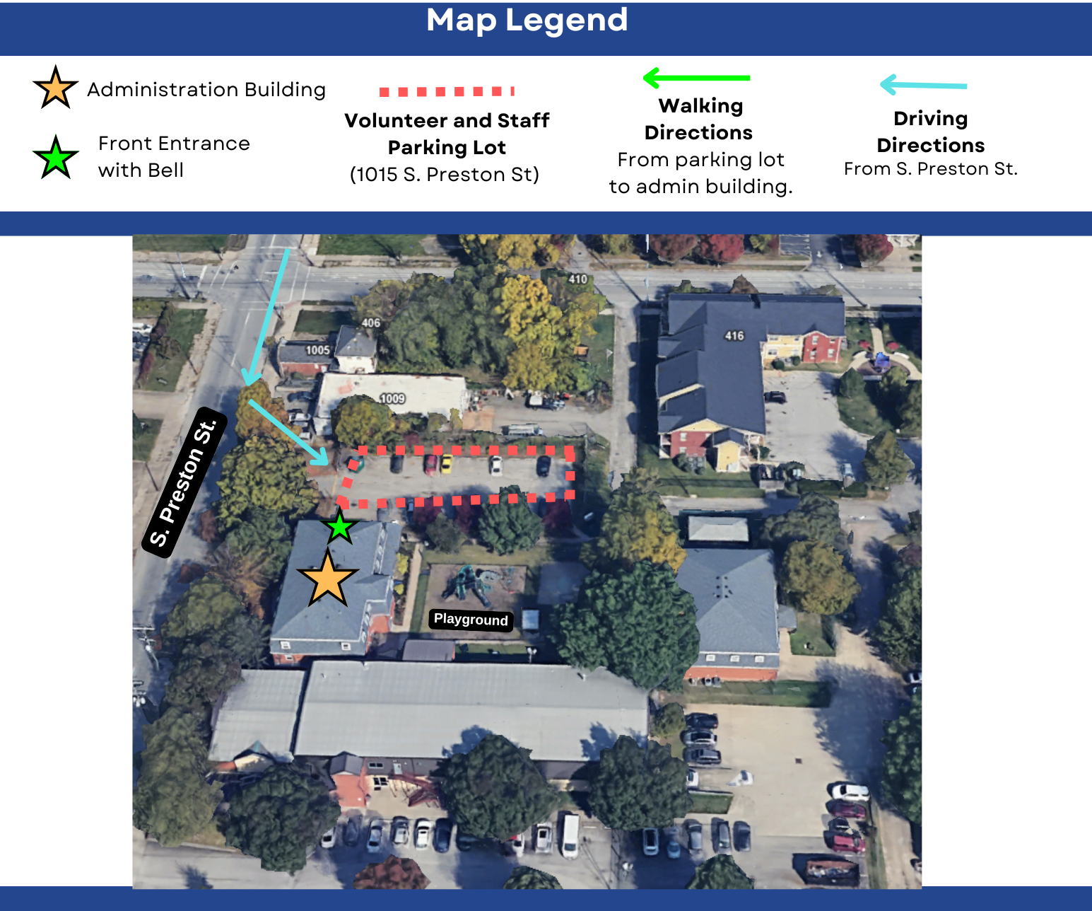 Parking is available in the parking lot at 1029 S. Preston Street (on either the playground or opposite side). Enter on the opposite side of the playground. Please ring bell if locked.
